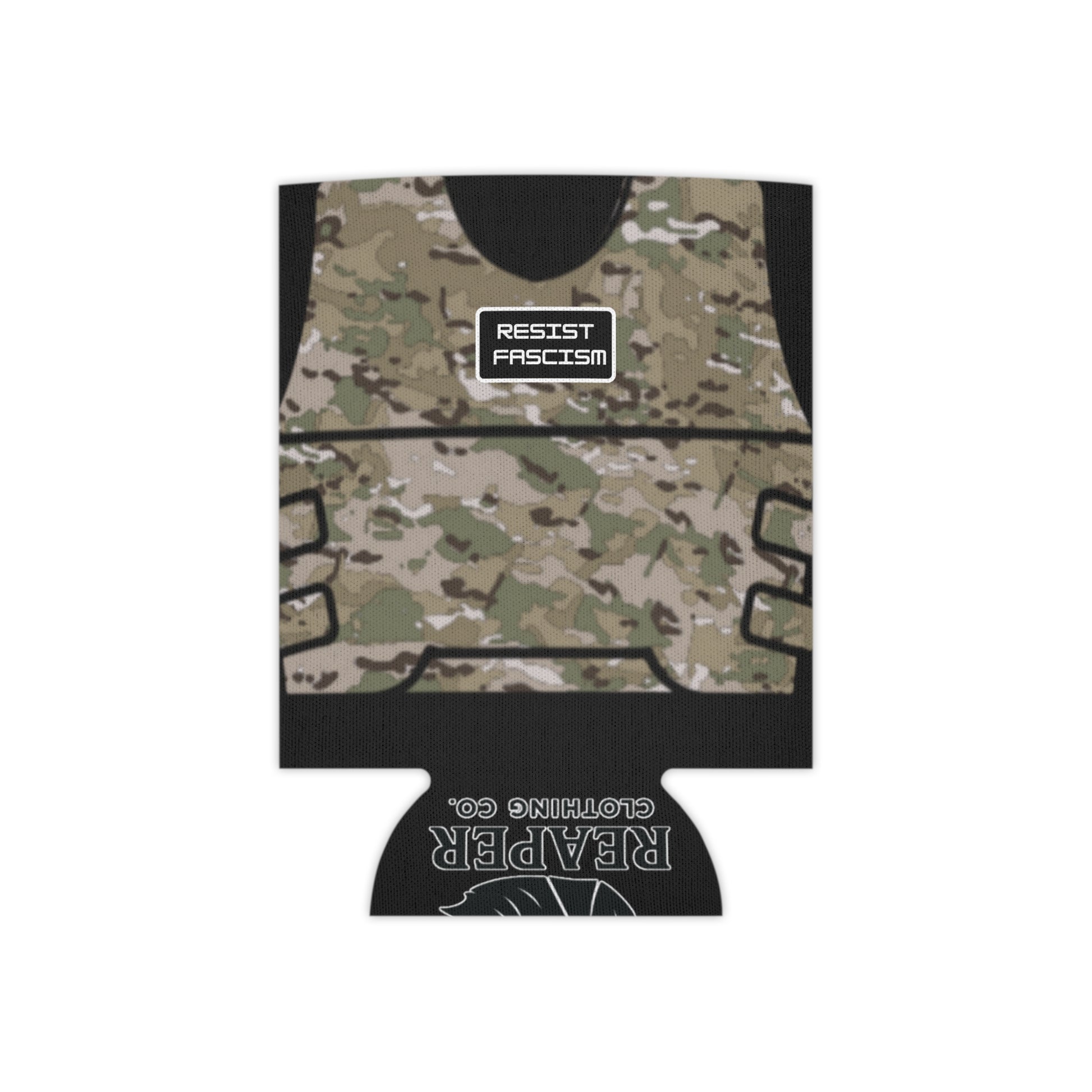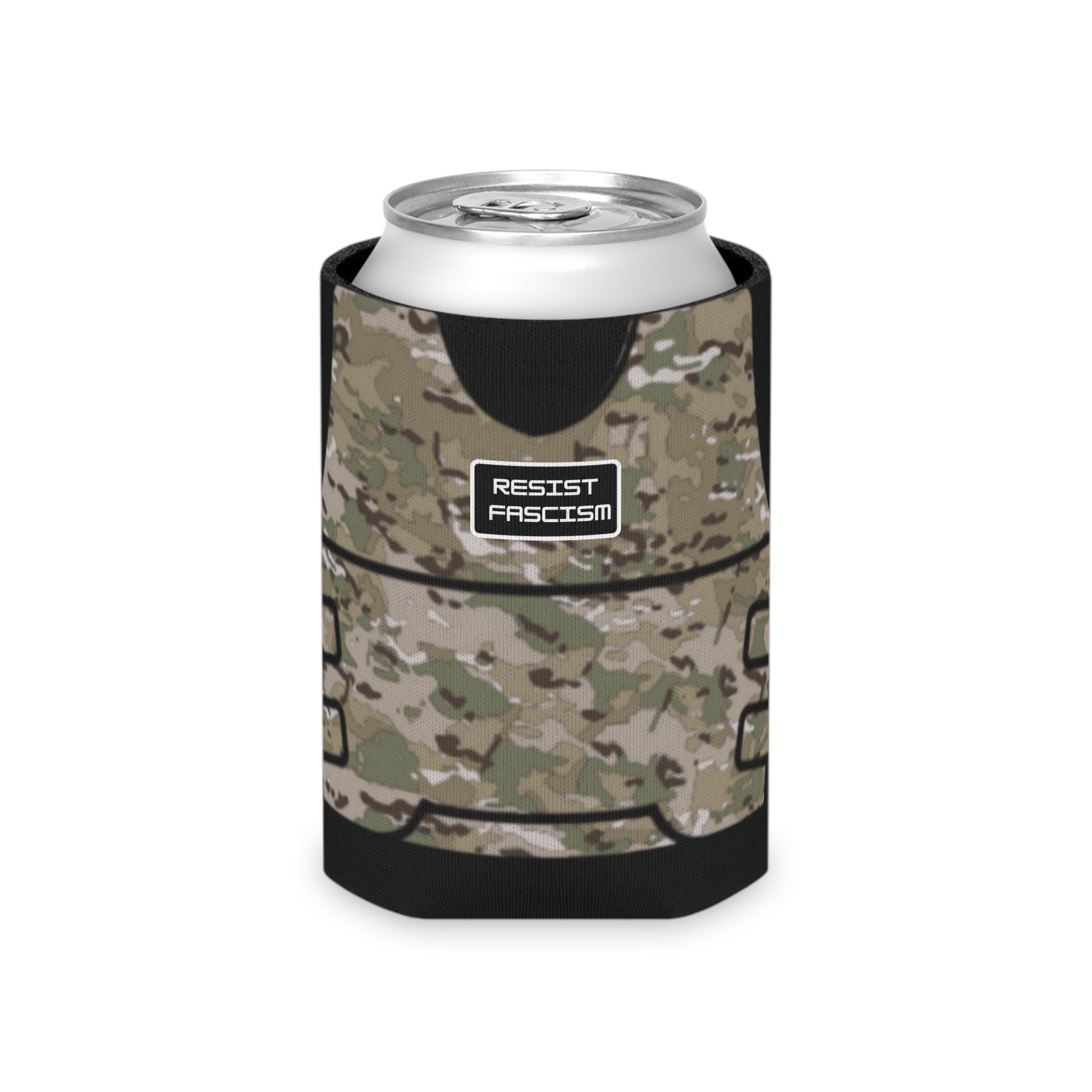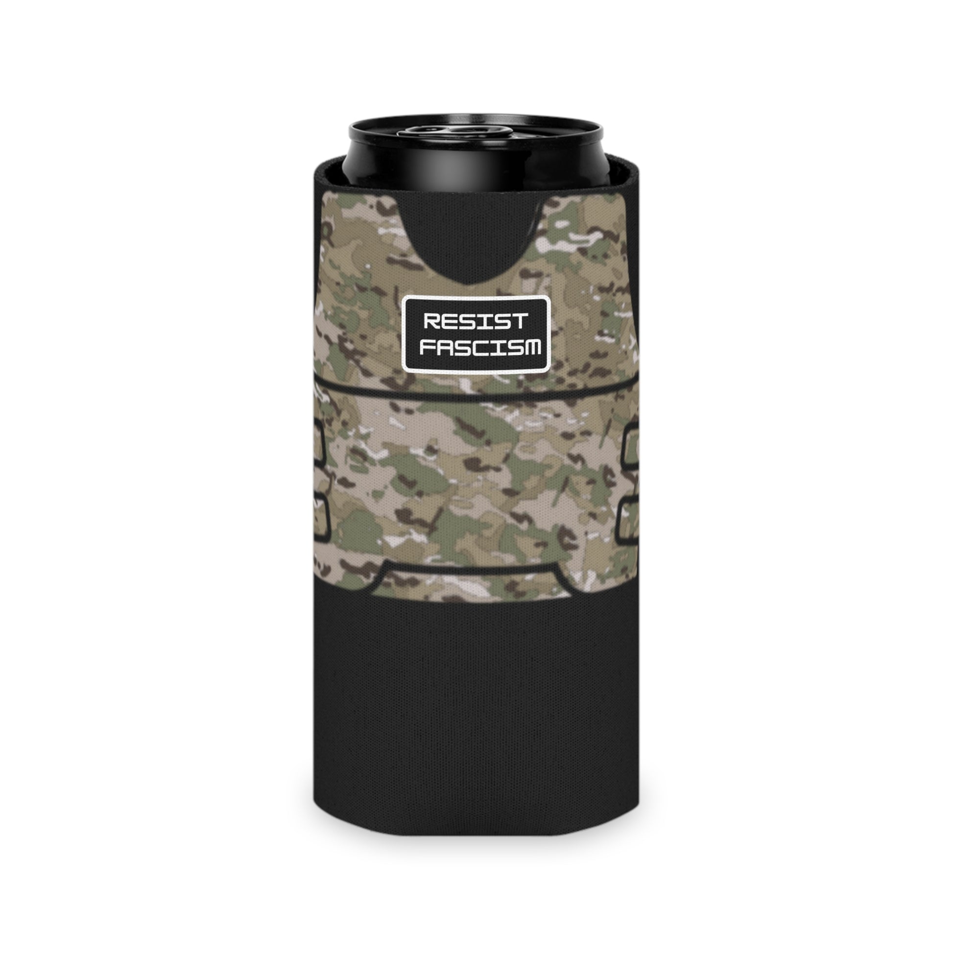 Featuring a camo tactical vest print with Pride and Resist Fascism "patches". Don't let grabbing a drink keep you from the fight.