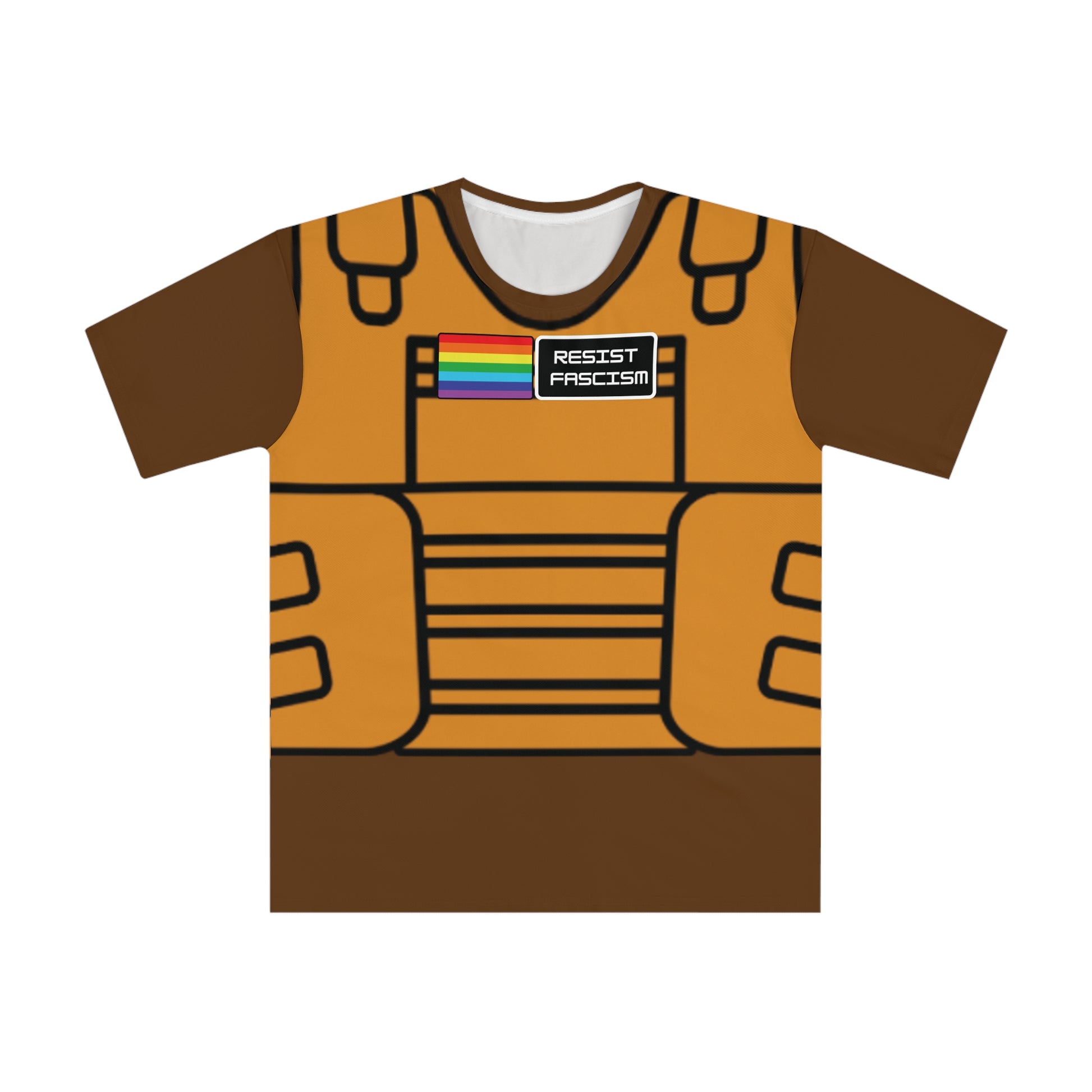 Crafted from a lightweight polyester and spandex blend, this shirt moves with you — whether you’re on the street, at the gym, or standing up for what’s right. The front graphic features a tan tactical vest print complete with a “Pride Flag” and “Resist Fascism” patch, symbolizing unity and strength in diversity.