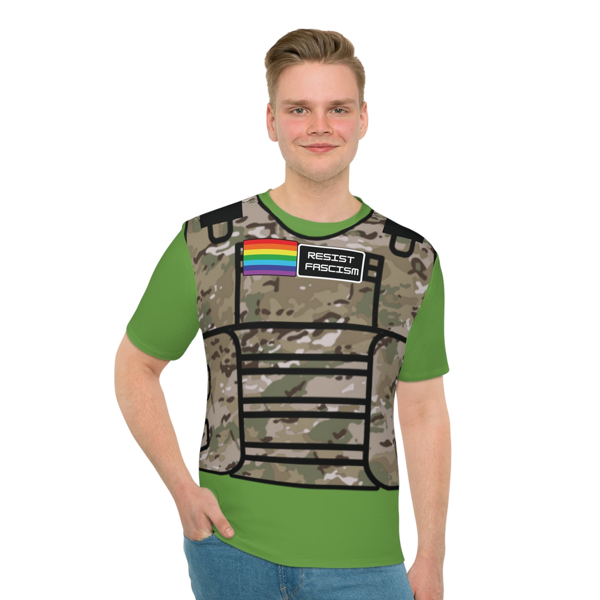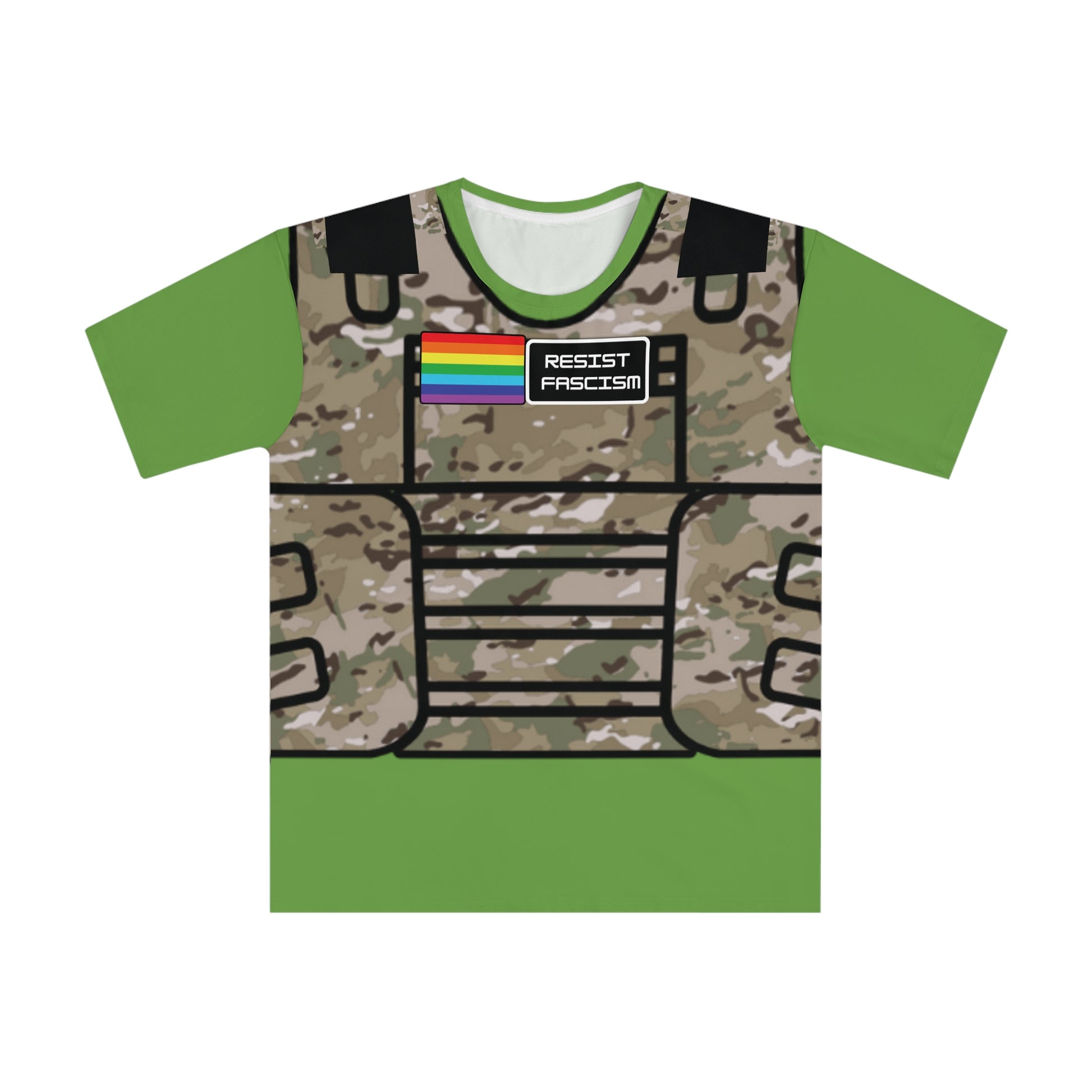 Crafted from a lightweight polyester and spandex blend, this shirt moves with you — whether you’re on the street, at the gym, or standing up for what’s right. The front graphic features a camo tactical vest print complete with a “Pride Flag” and “Resist Fascism” patch, symbolizing unity and strength in diversity.