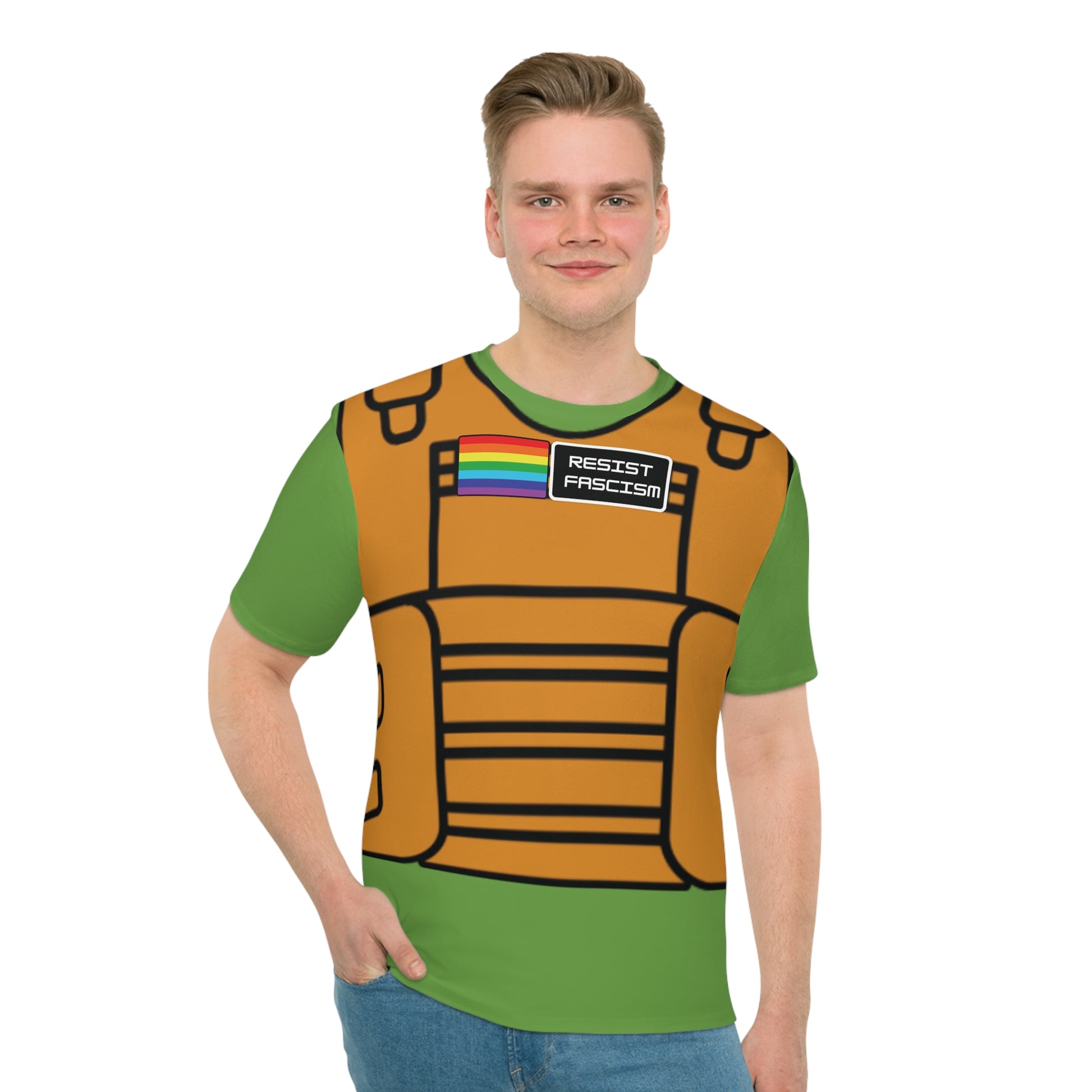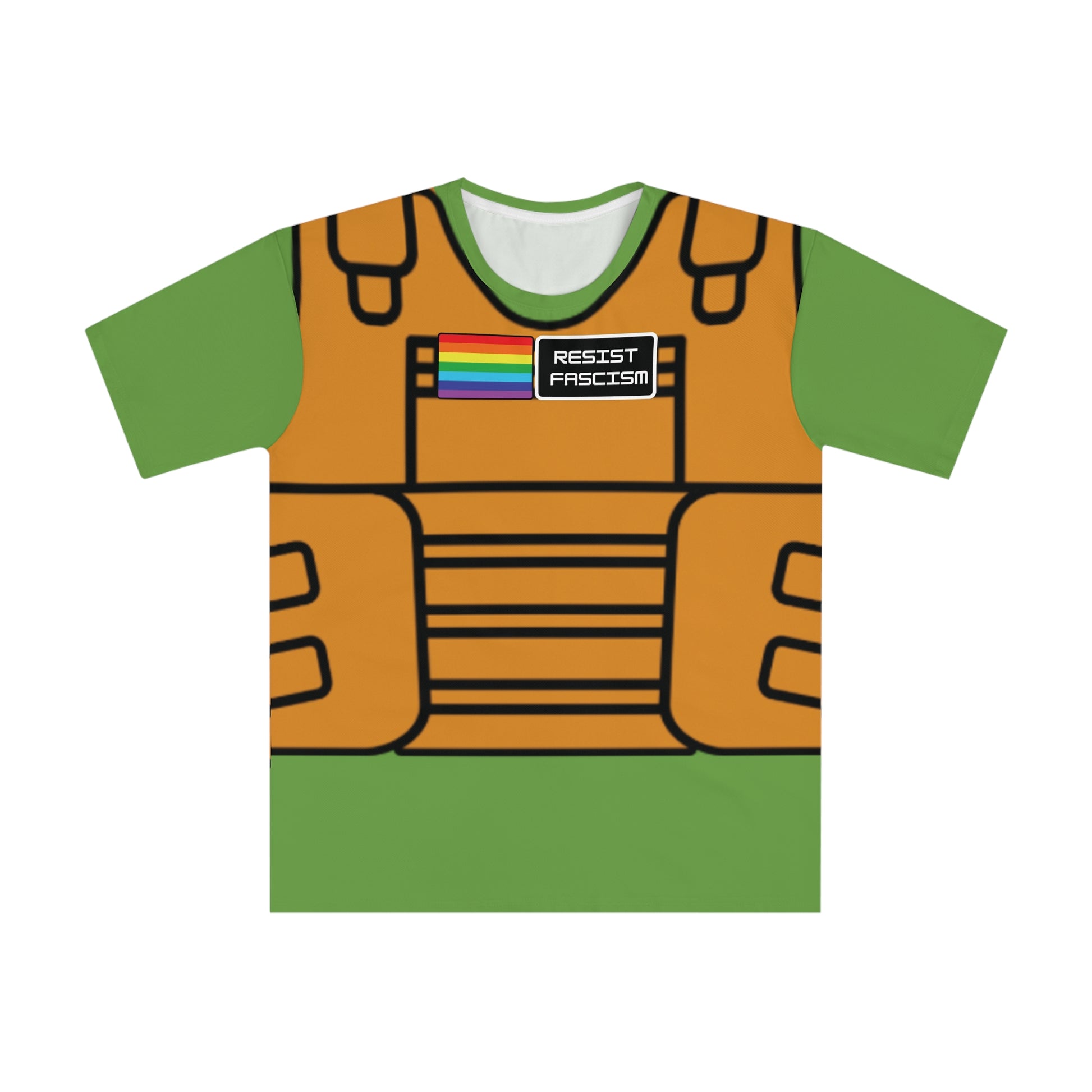 Crafted from a lightweight polyester and spandex blend, this shirt moves with you — whether you’re on the street, at the gym, or standing up for what’s right. The front graphic features a tan tactical vest print complete with a “Pride Flag” and “Resist Fascism” patch, symbolizing unity and strength in diversity.