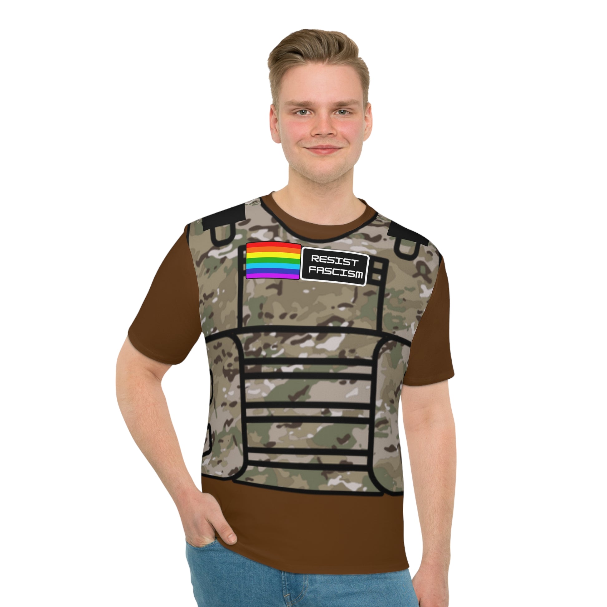 Crafted from a lightweight polyester and spandex blend, this shirt moves with you — whether you’re on the street, at the gym, or standing up for what’s right. The front graphic features a camo tactical vest print complete with a “Pride Flag” and “Resist Fascism” patch, symbolizing unity and strength in diversity.